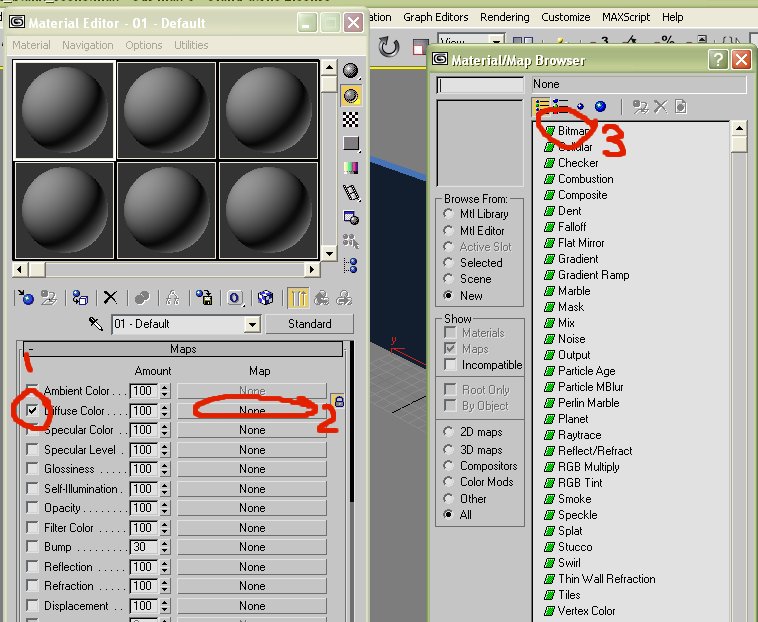 tick diffuse, the the "none", to bring up the "Material/Map Browser", that will bring up a dialog box..locate the folder you created with the textues you want to usse, then double click on the one you want, and it will appear on the first "Ball"..