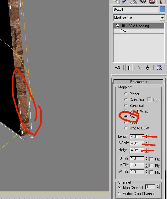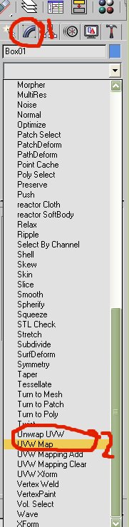 Select the "Wall"..then, on the right, click "Modify" (1), then pull down the "Modifier List", and locate "UVW Map" (2)..