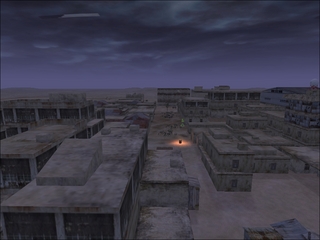 its a night version of a warn torn city...buildings out in the middle of no where are to make it seem like there are other towns.